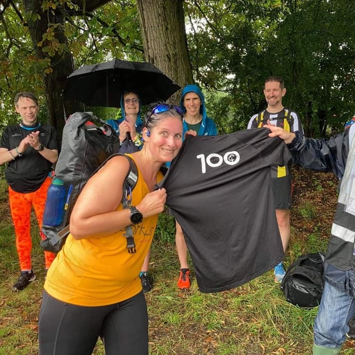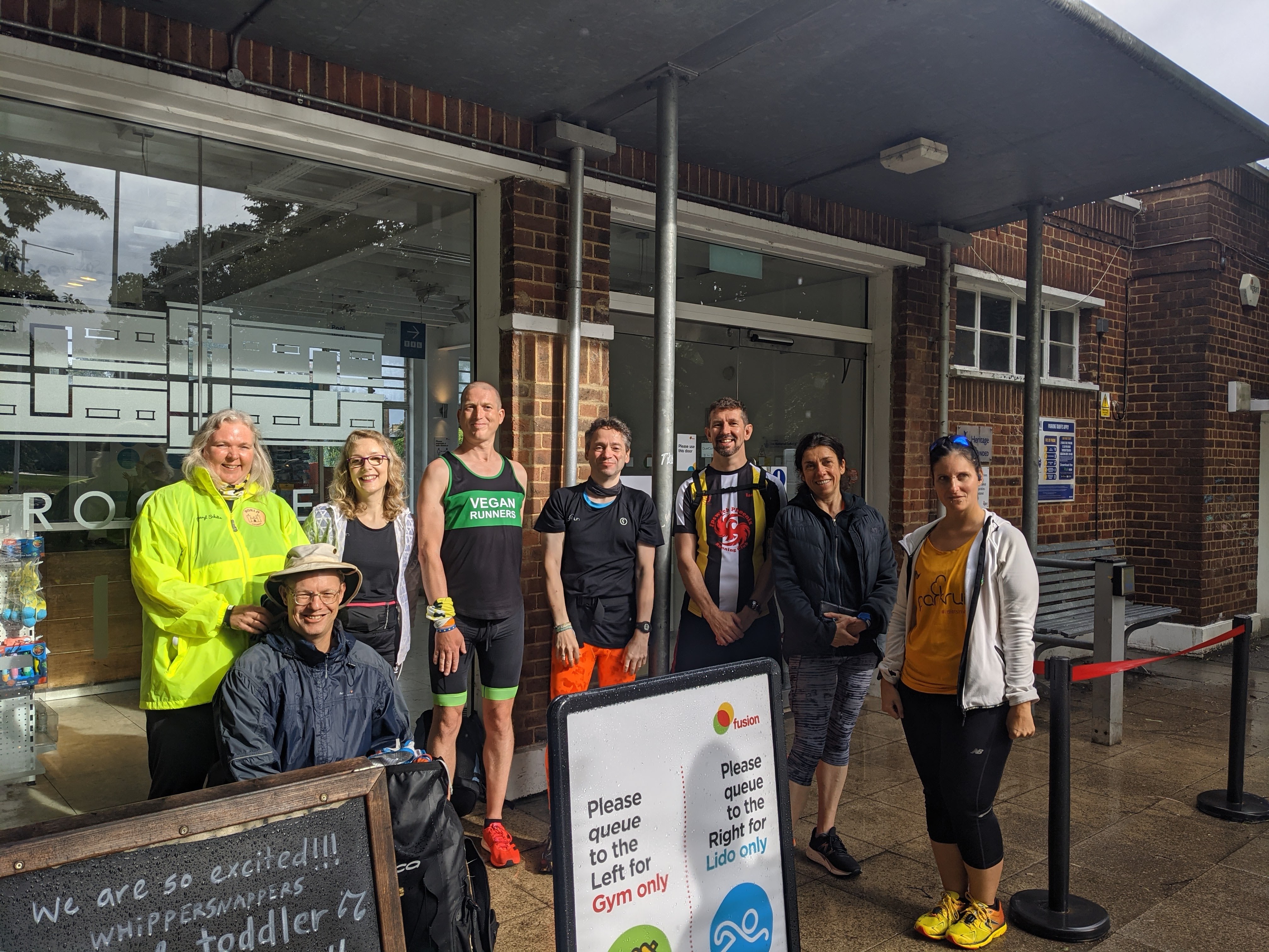 Meg decided to run with me as she is not a habitual runner, more of a swimmer (not much difference in this weather) but I noticed she was not having any trouble keeping up with me, in fact I got the distinct impression that she would be going a lot faster if I hadn’t been there. I wasn’t really surprised about this because I remember her as being the sort of teenager who was naturally fit and active, climbing trees and riding bikes and things, while I was indoors writing and drawing. We were having a nice conversation about the labour party, coronavirus and my mother and by the middle of the second lap, the rain which had somewhat eased off at the start returned with a vengeance so I wasn’t paying a lot of attention to how fast I was going and assumed it was going to be a really slow one and was therefore quite surprised to find we came in at a fairly average 36:23. All the others (except Cheryl and Bernd, who were walking it) were already gathered at the finish (in fact Paul had done a third lap, what a show off) to congratulate me on my persistence at a hobby I am no good at and unnatural fondness for getting up early on Saturday mornings. The Run Director presented me with (Rob’s) 100 shirt and I posed for a very wet, red faced photo before getting in the lido because obviously I wasn’t wet enough already.