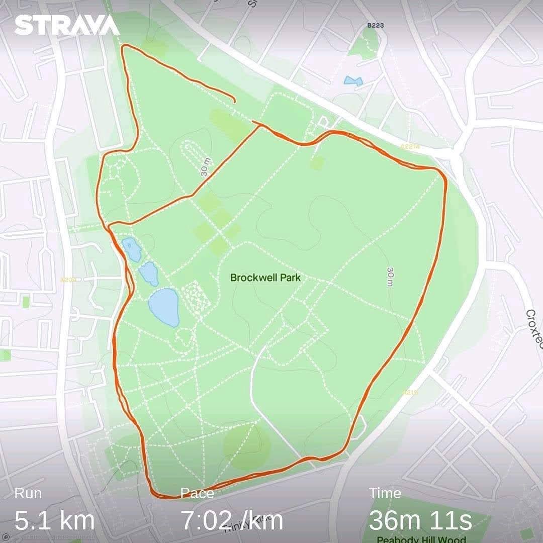 Slowest time: 54:08 walking Beckenham Place with my mother, or 47:11 at Stratford Park (Stroud) with no one but myself and the mud to blame.