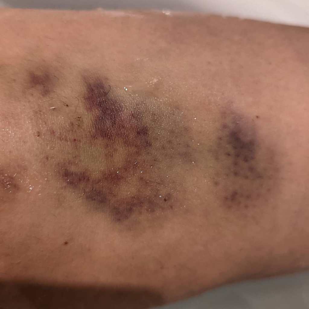 Catalogue of injuries: Left knee (purple, unable to bend without squealing), rest of left leg (not actually injured but just coming out in sympathy), right hand (hole, swollen, purple, unable to operate mouse), left elbow (lost 59 pints of blood through hole size of pinprick), left ribs (no visible damage but unable to take deep breath or do Les Mills Core).
